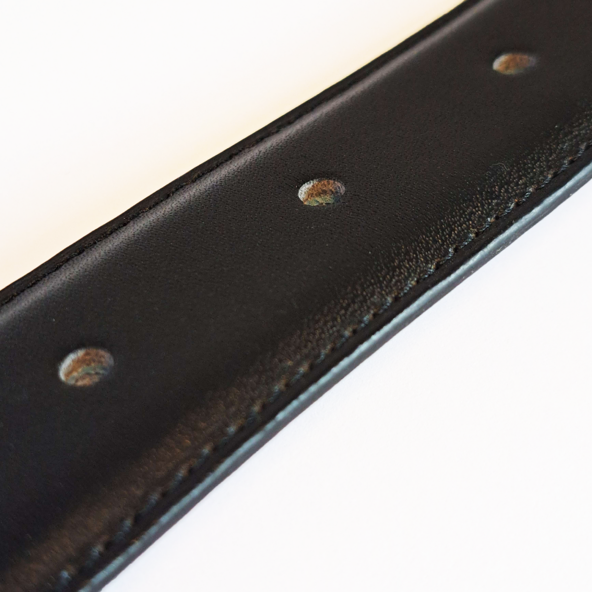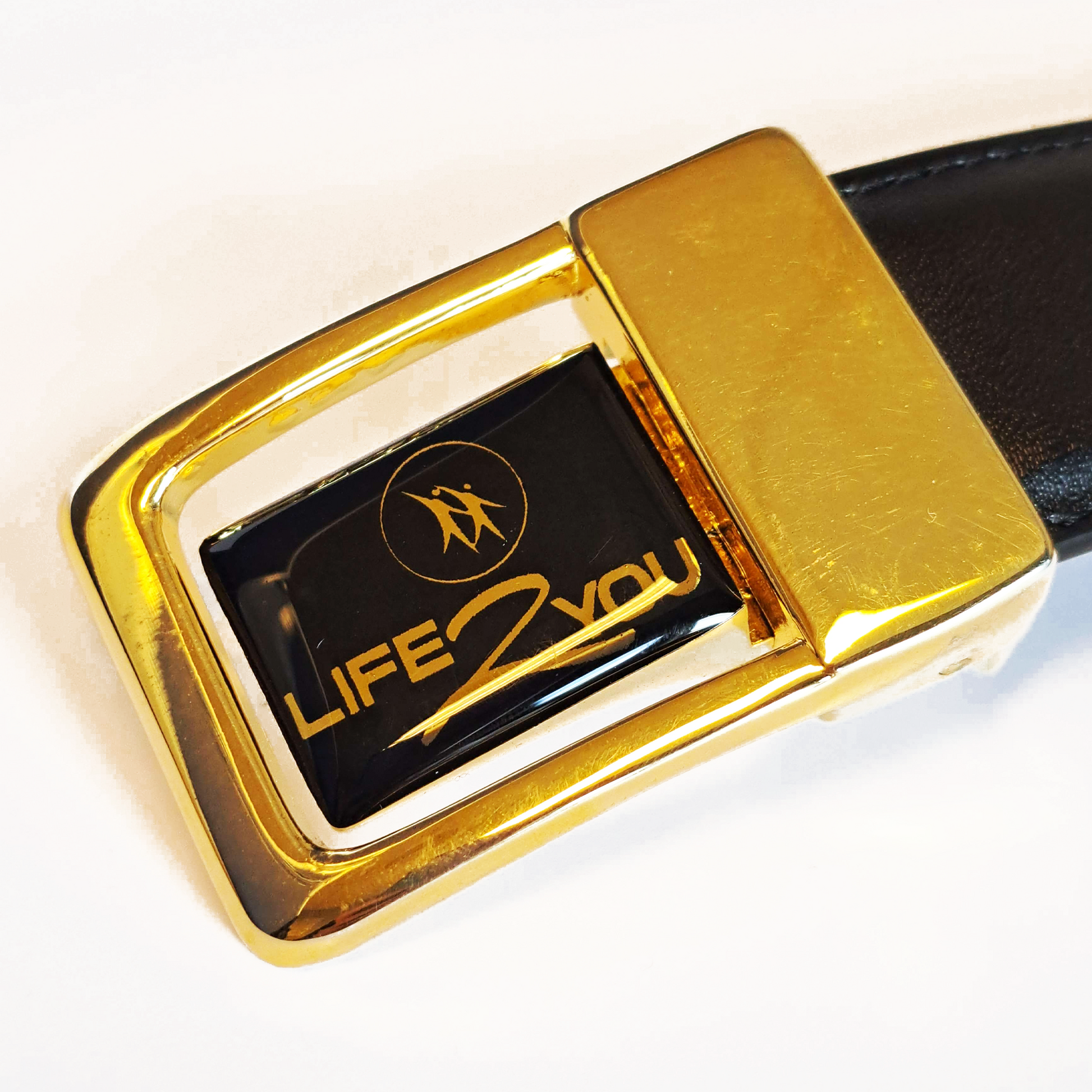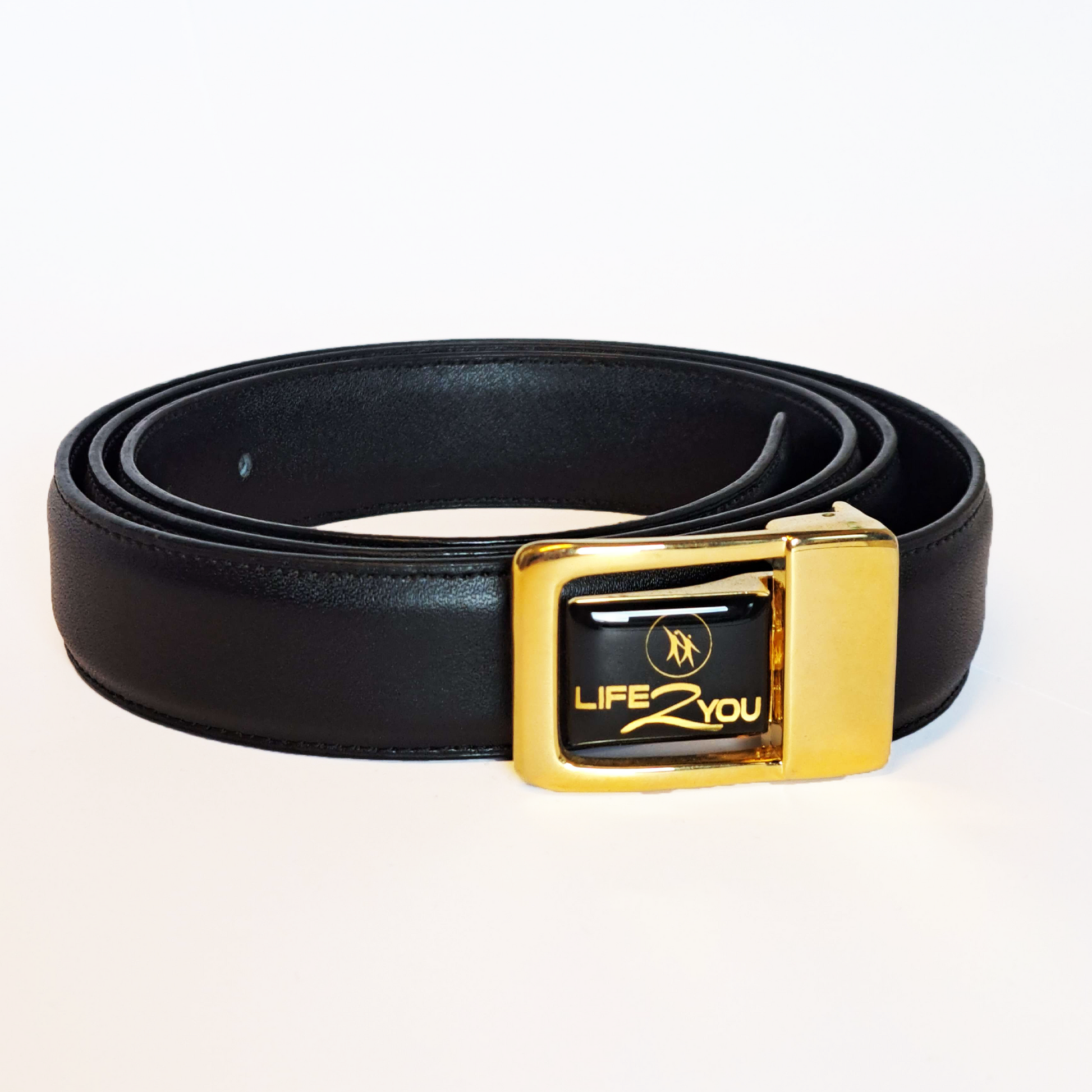 Svart skinnbelte av høy kvalitet med innlagte magneter. Dekorert med en diskré og praktisk gullfarget spenne. Lengde på totalt 130cm.