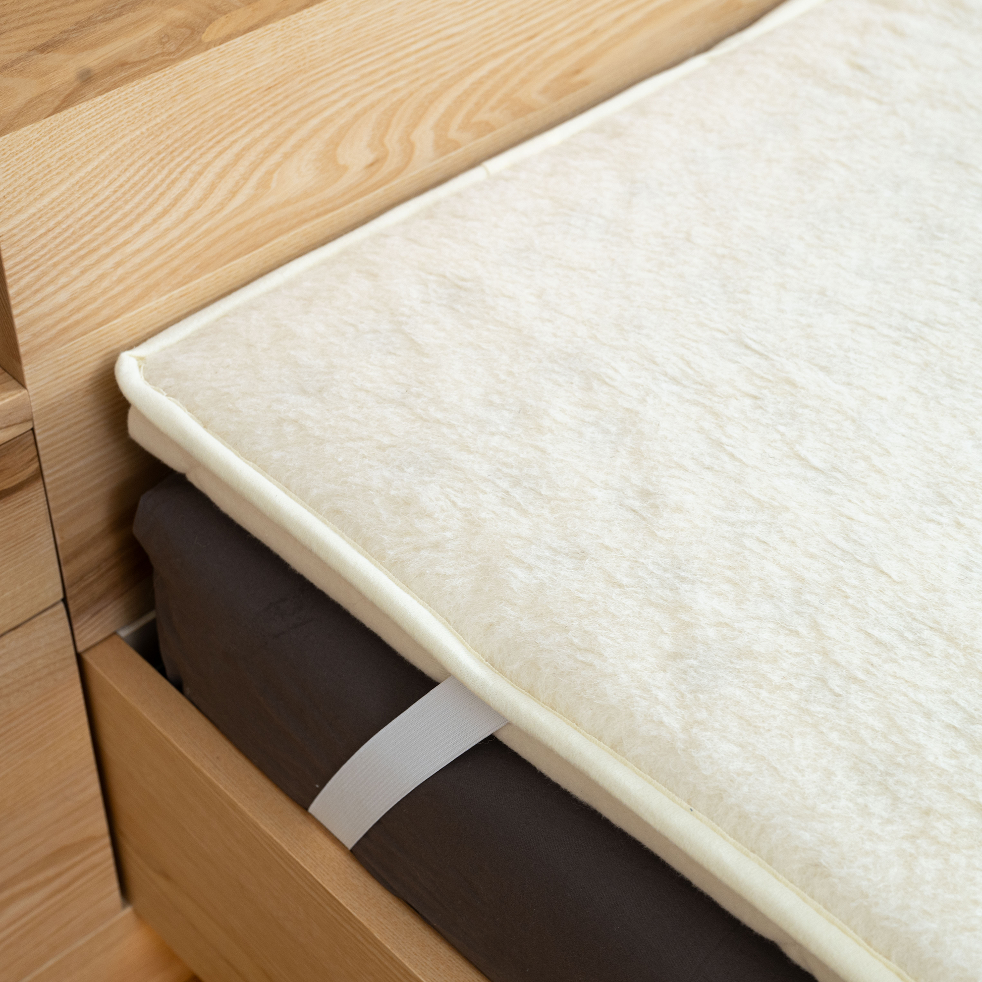 Overmadrass i naturlig farge med et ytterlag i 100% merino. I tillegg til å være svært mykt å sove på, har ull en rekke fordeler: